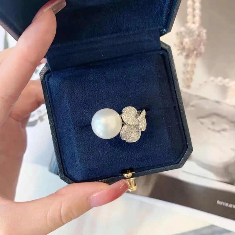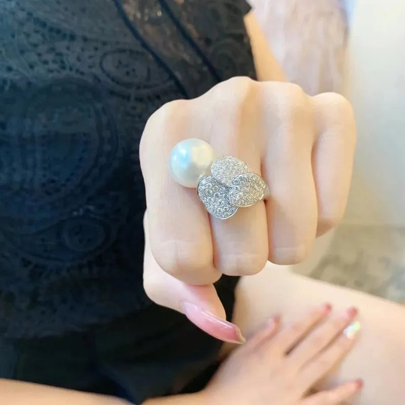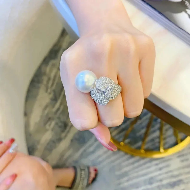 Elevate your elegance with this Luxury Petals Big Pearl Ring. Designed for women who appreciate trendy and eye-catching jewelry, this ring features a stunning simulated pearl surrounded by shimmering rhinestones, all set in a unique petals design.