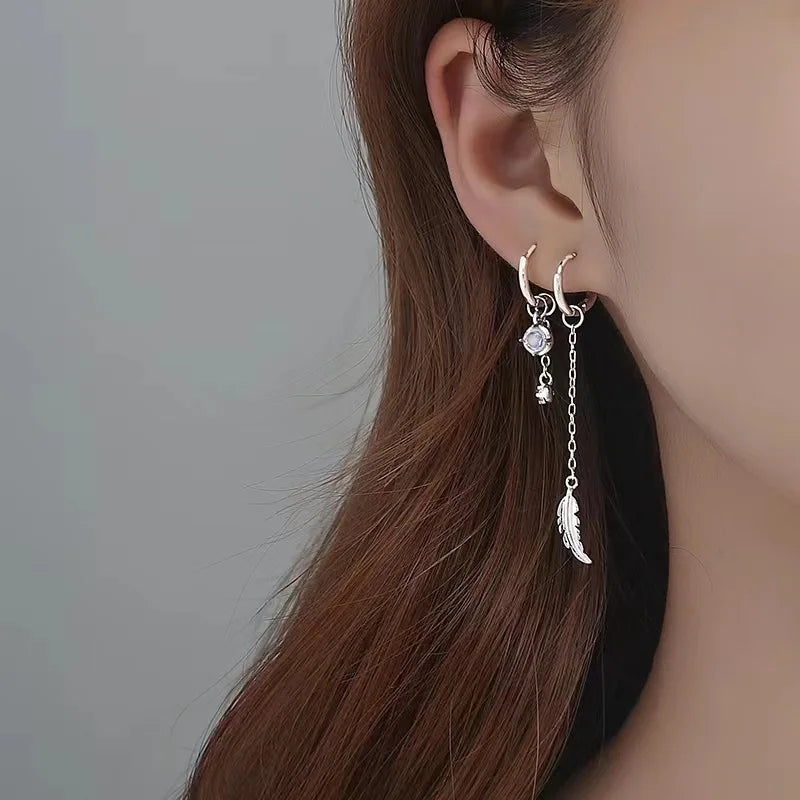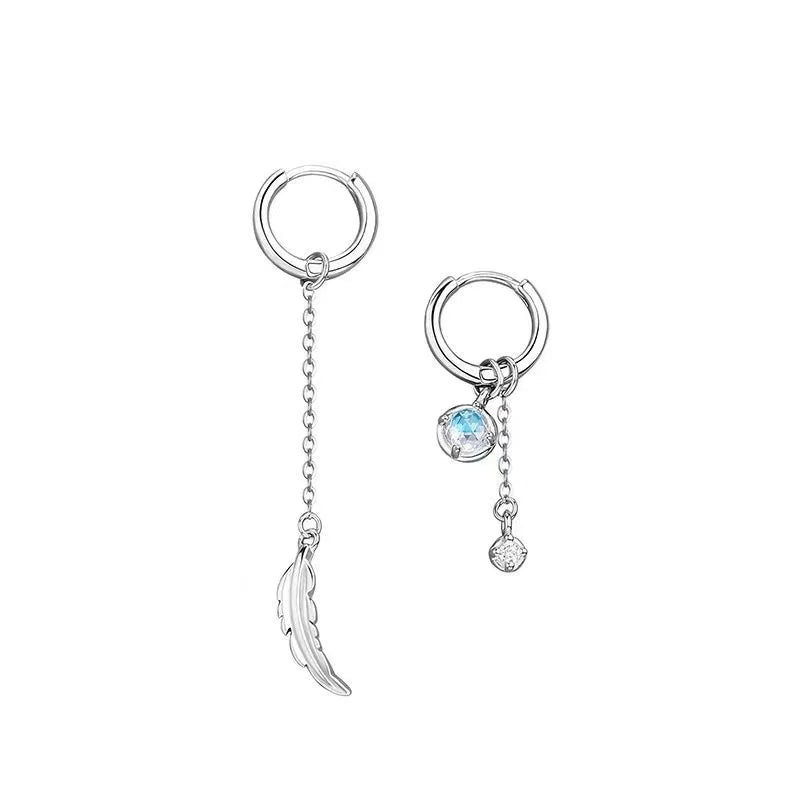 Winoneday 1Pair Silver Color Asymmetric Moonstone Feather Earrings for Women Personality Tassel Ear Line Ear Buckle