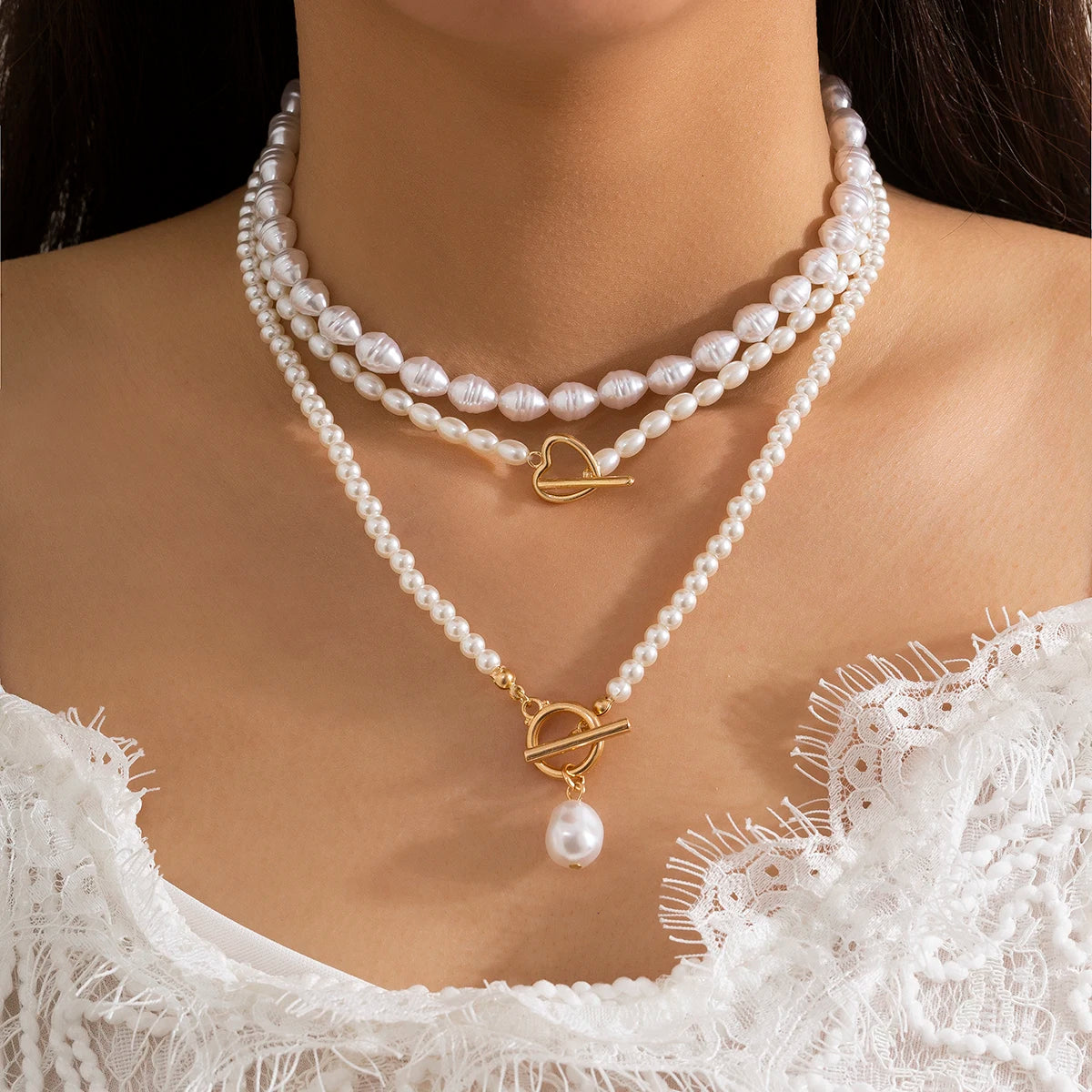 Ingemark Multilayer Imitation Pearl OT Buckle Pendant Necklace Women Wed Bridal Goth Bead Chain Y2K Accessories Neck Jewelry