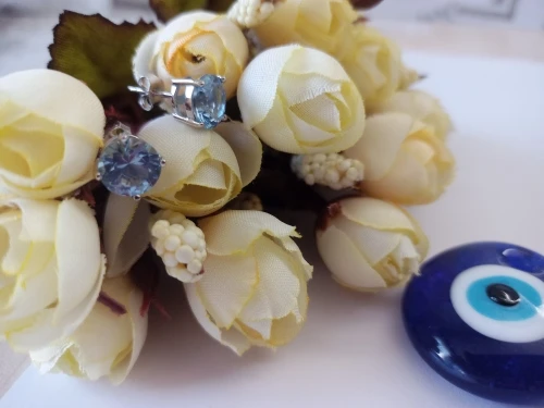 The main stone is a created nano sky blue topaz, set in a classic and timeless design. The silver back finding ensures a secure and comfortable fit.