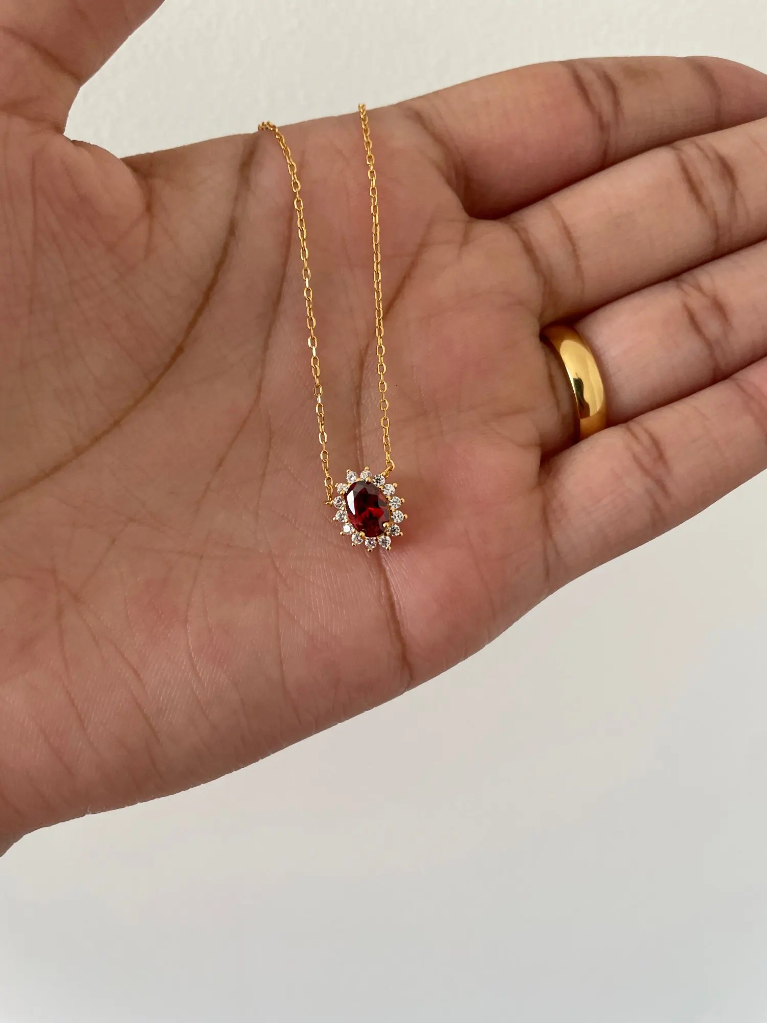 Enhance your elegance with 925 Sterling Silver Ruby Color 18K Gold Plated Chain Necklace. This retro-style necklace features vibrant garnet red cubic zirconia stones, adding a touch of sophistication to any outfit.