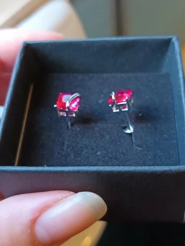 The butterfly push-back ensures a secure and comfortable fit, making these earrings ideal for anniversaries, engagements, weddings, parties, or as a thoughtful gift for a girlfriend, wife, or mom. The square-cut created rubies add a striking color and sophistication to any outfit.